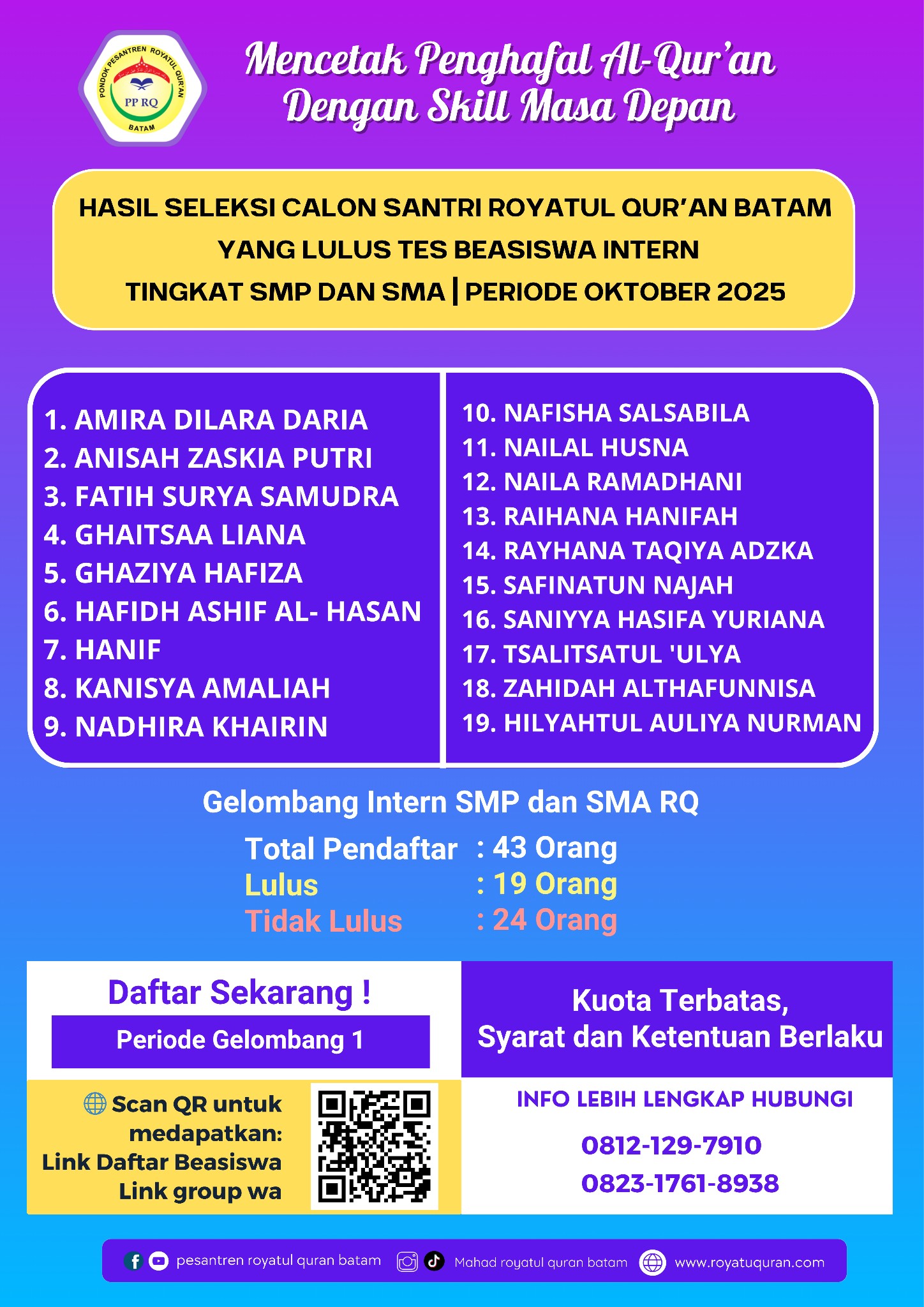 📢 Pengumuman Hasil Seleksi Beasiswa Intern Royatul Qur’an Batam 📢