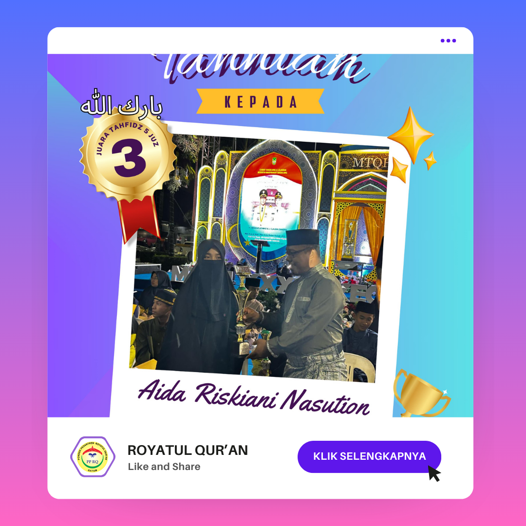 Santriwati Pesantren Royatul Qur’an kembali mengukir prestasi dalam Musabaqah Tilawatil Qur’an (MTQ) Kecamatan Sagulung di TOP 100 Tembesi pada Kamis 20 februari 2025.